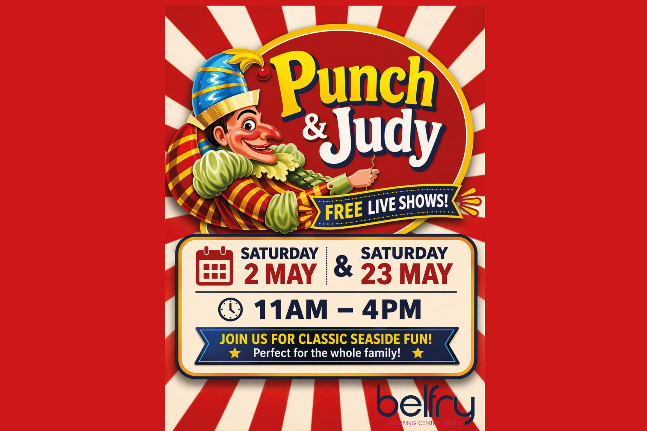 🎪 This Saturday we have a traditional Punch & Judy show in the Belfry from 11am – 4pm by the Belfry Stage – and it’s free! Come and join in the fun!